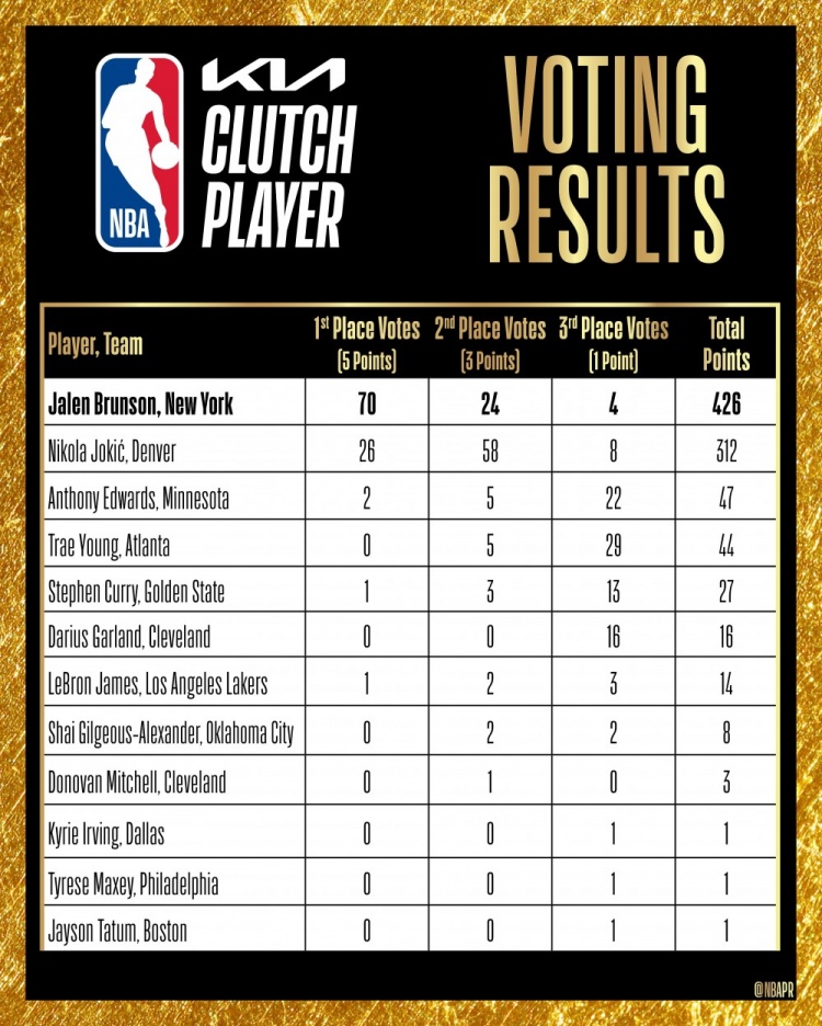 欧文、马克西和塔图姆各得到1张第三选票,总得分1分。