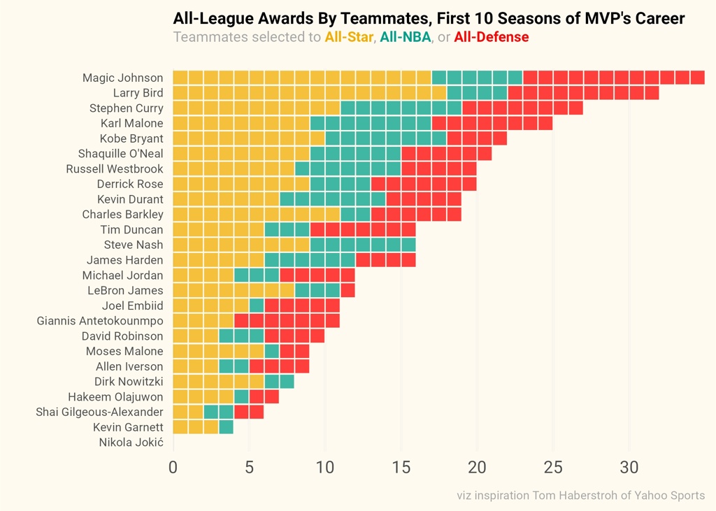 以下为部分MVP球员职业生涯前10个赛季中队友入选联盟最佳奖项统计: