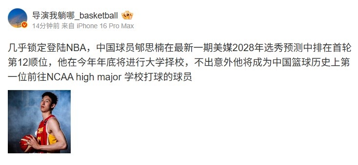 对此,媒体人导演我躺哪写道:“几乎锁定登陆NBA,中国球员郇斯楠在最新一期美媒2028年选秀预测中排在首轮第12顺位,他在今年年底将进行大学择校,不出意外他将成为中国篮球历史上第一位前往NCAA high major学校打球的球员。”