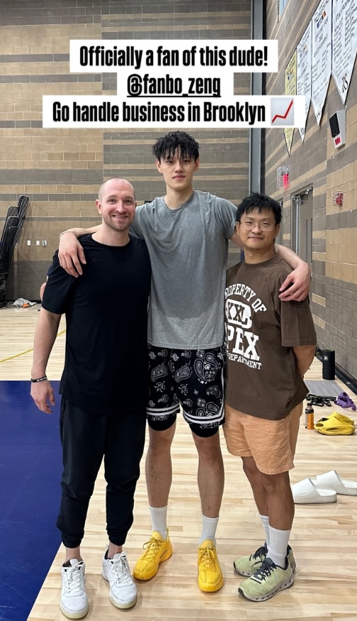 训练师在社媒上写道:“正式成为这家伙@曾凡博的粉丝了,(你)该去布鲁克林办正事了。”
