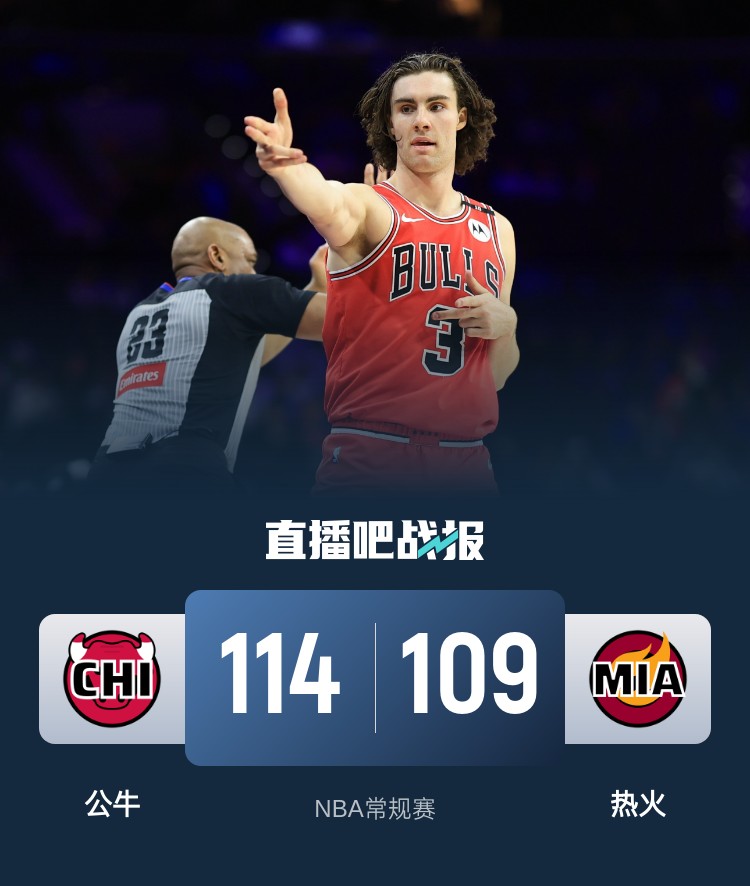 比赛上来,两队打得相对胶着,不过在首节后半段热火开始占据主动并将分差拉开到两位数,阿德巴约迎着两人封堵打进压球跳投,次节热火的进攻有所下滑,单节只拿到19分,公牛将分差缩小回个位数,半场结束时热火还领先7分;下半场回来,科林斯连中两记三分将分差追到仅剩1分,但热火并没有给他们反超的机会,末节热火的进攻表现更加糟糕,半节只拿到5分,公牛终于抓住机会完成反超,关键时刻罗齐尔空位三分不中,基迪则是命中杀死比赛的三分,希罗续命远投三不沾 出界,最终公牛17分逆转热火,送给后者三连败。