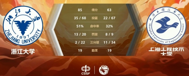 浙江大学:袁海洋16分7篮板3抢断、张烜睿15分3篮板、贾亦杰8分3篮板3助攻3抢断、石尔登4分5篮板、刘凯博17分3篮板4助攻4抢断、曹思杰10分2抢断。