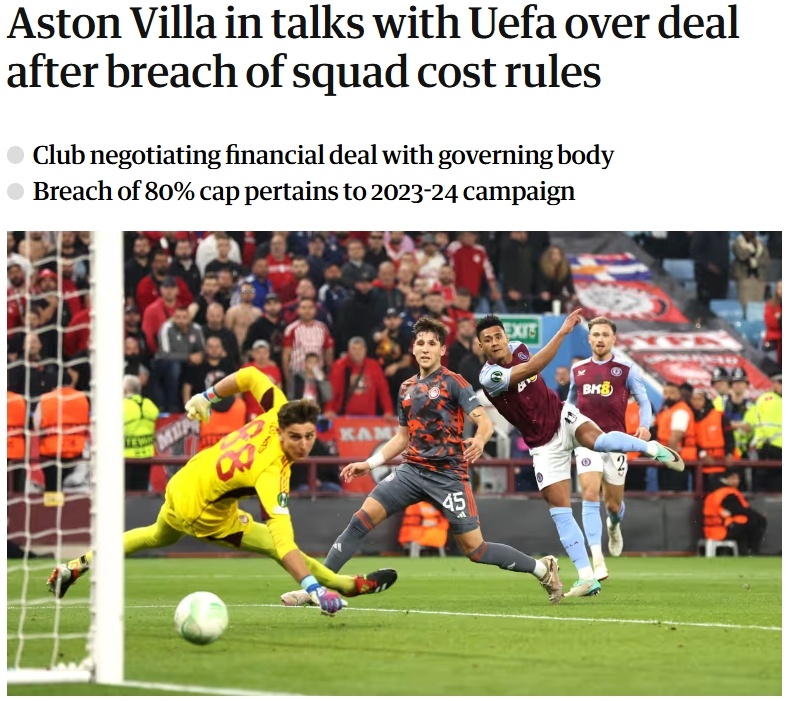 维拉公布的2023-24赛季财报显示,他们的总薪资为2.52亿英镑,而总收入为2.577亿英镑,虽然球员以外的工作人员工资不列入该规则的计算范围,但《卫报》了解到维拉的球员成本仍超出了收入80%的上限。