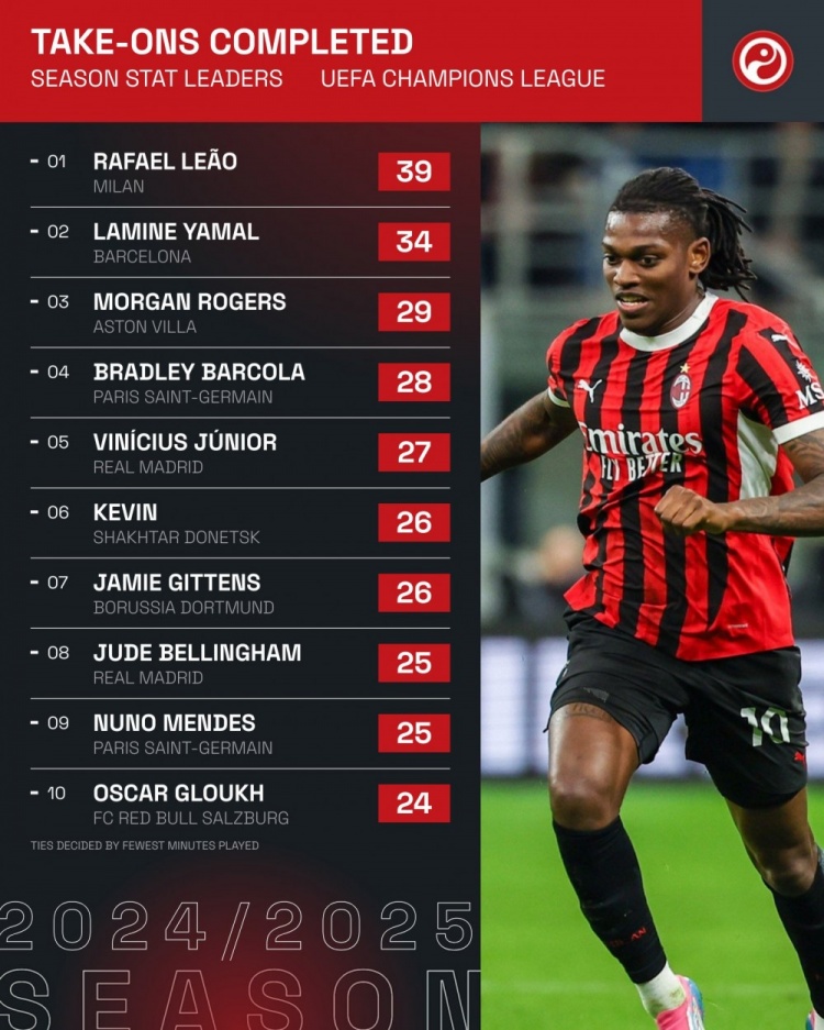 4月11日讯 据Squawka数据统计,本赛季欧冠联赛中只有两名球员完成过人30次以上。其中AC米兰前锋莱昂39次,巴萨前锋亚马尔34次。