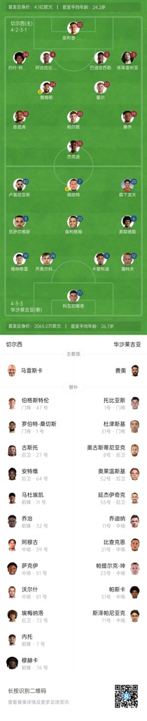切尔西替补:1-桑切斯、47-博格斯特罗姆、7-内托、11-马杜埃凯、27-古斯托、32-乔治、39-阿穆古、51-萨克伊、64-安特维、72-埃梅纳洛、76-穆赫卡、81-沃尔什