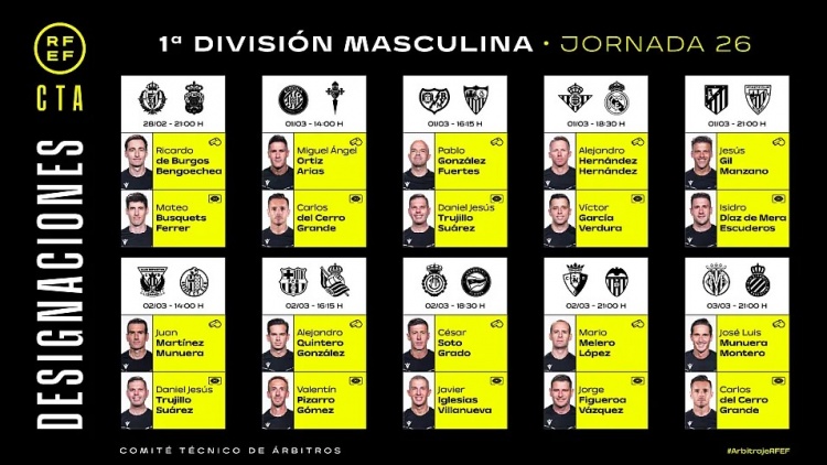 2月27日讯 本周末,西甲第26轮将拉开战幕,西班牙足协官方公布了本轮比赛的裁判安排。埃尔南德斯执法皇马客战贝蒂斯,昆特罗-冈萨雷斯主裁巴萨主场迎战皇家社会。