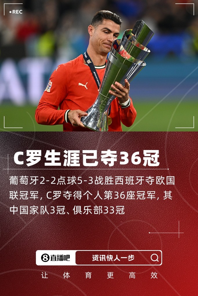 6月9日讯 欧国联决赛,葡萄牙战胜西班牙夺冠,C罗夺得个人第36座冠军。