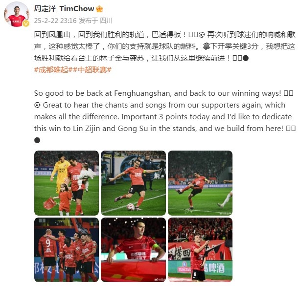 周定洋在社媒晒出比赛照片并配文写道:“回到凤凰山,回到我们胜利的轨道,巴适得板!️ 再次听到球迷们的呐喊和歌声,这种感觉太棒了,你们的支持就是球队的燃料。拿下开季关键3分,我想把这场胜利献给看台上的林子金与龚苏,让我们从这里继续前进! ”