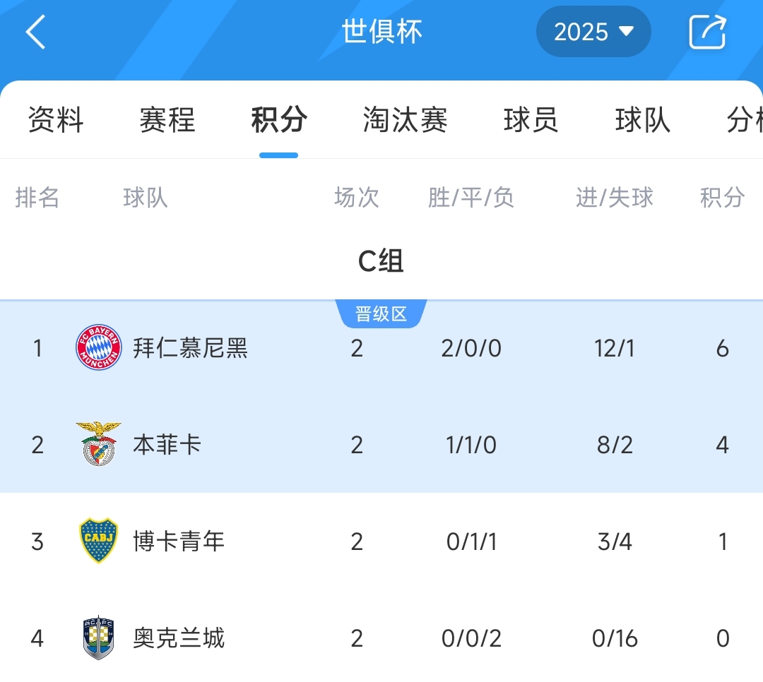 C组前两轮比赛中,拜仁2连胜高居小组榜首,已经提前一轮出线;本菲卡取得1胜1平,暂列小组第2。