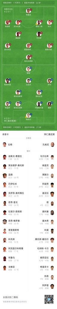 拜仁替补:18-佩雷茨、40-乌尔比希、4-塔、30-基亚拉、49-阿兹努、6-基米希、8-格雷茨卡、27-莱默尔、42-穆西亚拉、46-伦纳特-卡尔、47-桑托斯-戴伯尔、9-凯恩、11-科曼、17-奥利塞、41-阿萨雷