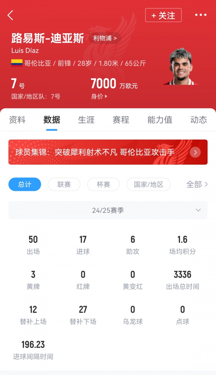 迪亚斯2022年冬窗从波尔图加盟利物浦,转会费总价可达到5000万镑,目前他的身价为7000万欧元。