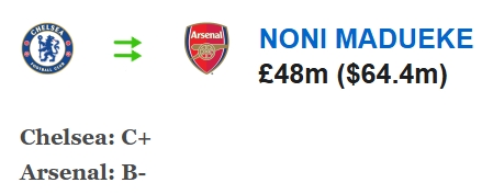 07月19日讯 阿森纳官宣从切尔西签下边锋马杜埃凯,ESPN照例给出了对这笔转会的评级,买家阿森纳被打分B-,卖家切尔西则被评C+。