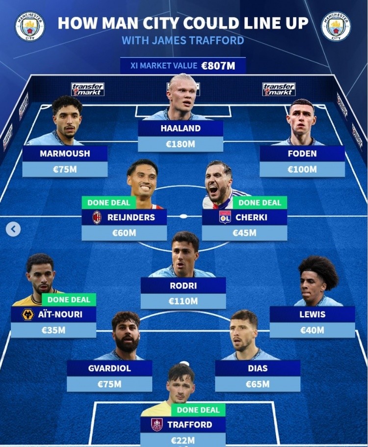 7月30日讯 曼城已经官宣签下伯恩利门将特拉福德,《转会市场》也预测了曼城新赛季主力阵容,4位新援在列。