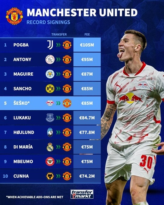 曼联将向RB莱比锡支付初始转会费7650万欧,外加850万欧的附加条款,这些附加条款据信几乎已成定局。