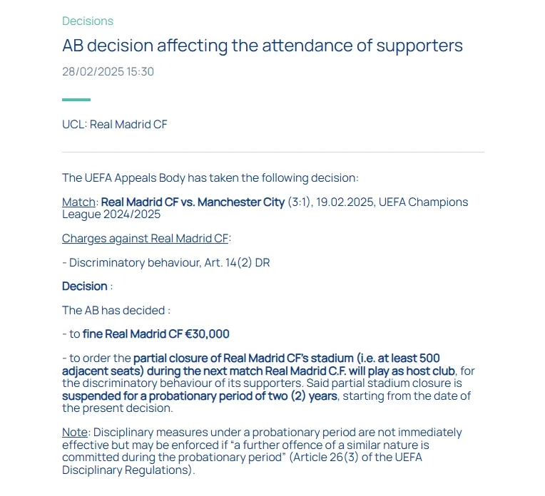 根据裁决书:“若皇马球迷在未来两年观察期内再次出现类似违规行为,将立即执行部分看台关闭措施。”该观察期自2月28日裁决公布之日起计算。除看台关闭警告外,欧足联还同步开出了立即生效的3万欧元罚单。
