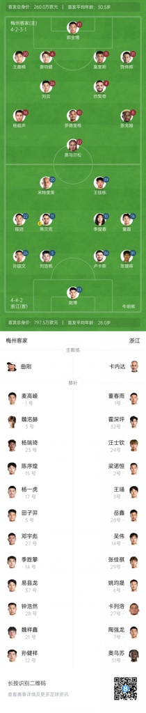 08月24日讯 今晚19:00中超第22轮,梅州vs浙江。赛前双方公布了首发名单。