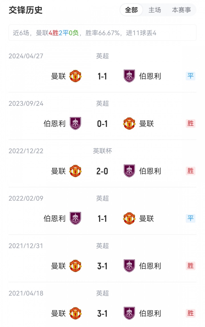 伯恩利9次作客老特拉福德球场的战绩为1胜4平4负,在超半数比赛中避免了失利。