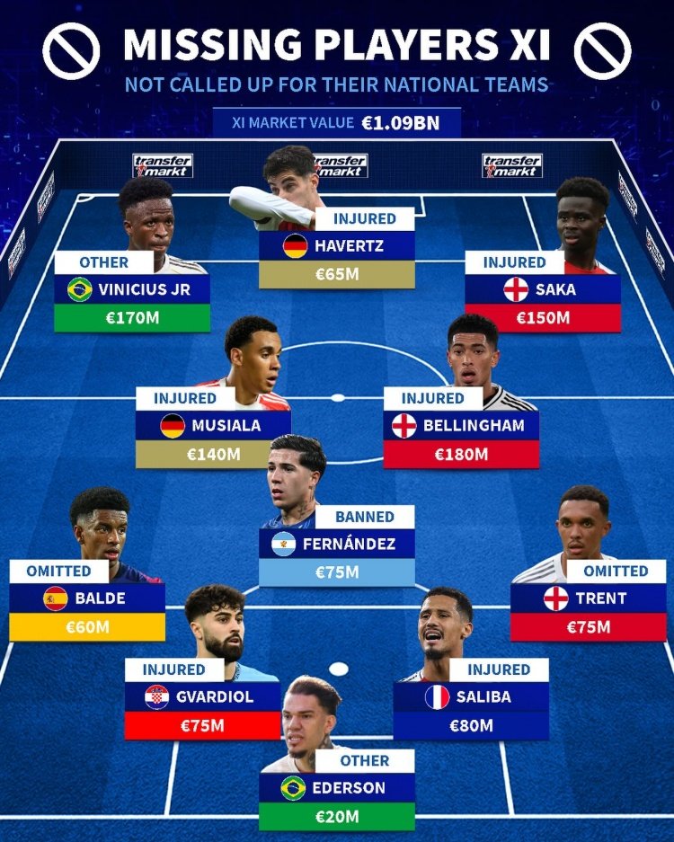 9月6日讯 德国转会市场列出了缺席9月份国家队比赛的球员阵容,维尼修斯、萨卡、穆西亚拉、贝林厄姆在列,德转总价10.9亿欧。