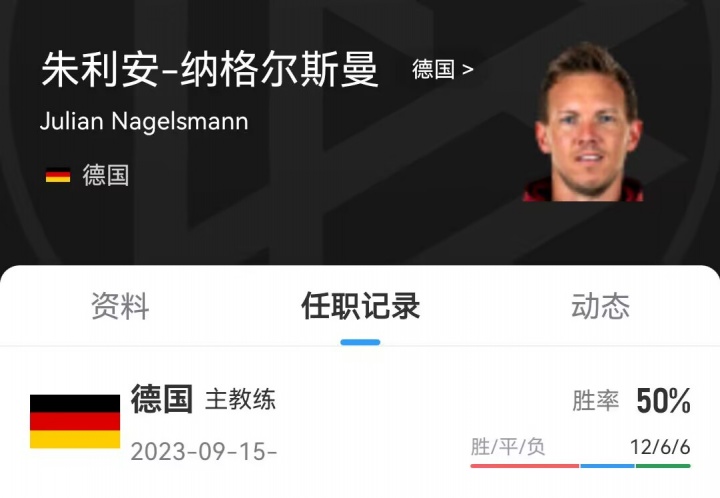 事实是,纳格尔斯曼在任期内只赢得了一半比赛(12/24)。相比之下,前任弗里克的战绩是12胜/25场比赛。因此。从统计上看,纳帅并不比弗里克明显成功。
