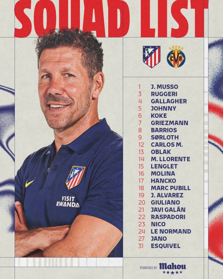 9月13日讯 北京时间明天凌晨3点,西甲第4轮马竞主场对阵比利亚雷亚尔,马竞此役大名单公布。