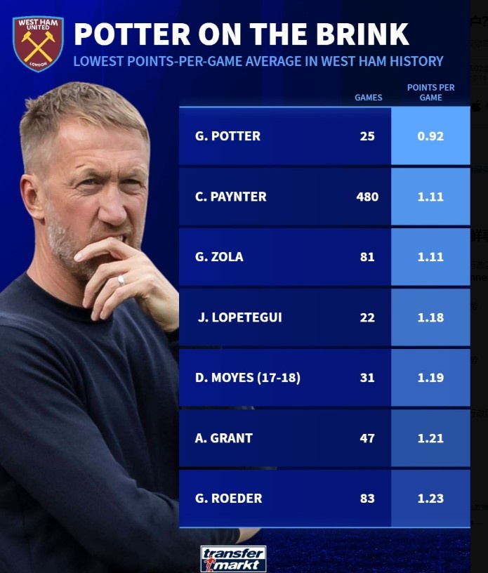 9月21日讯 英超第5轮比赛,西汉姆联在主场以1-2的比分不敌水晶宫,格拉汉姆-波特遭遇下课危机。根据数据统计,波特是西汉姆联队史拿分率最低的主教练,场均仅能拿到0.92分。