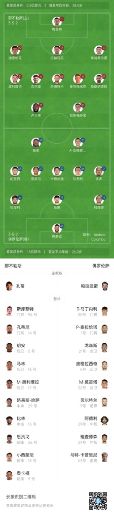 佛罗伦萨首发:43-德赫亚、2-多多、6-卢卡-拉涅利、15-科穆佐、18-巴勃罗-马里、65-帕里西、27-恩多尔、32-卡塔尔迪、44-法乔利、10-古德蒙德森、20-基恩